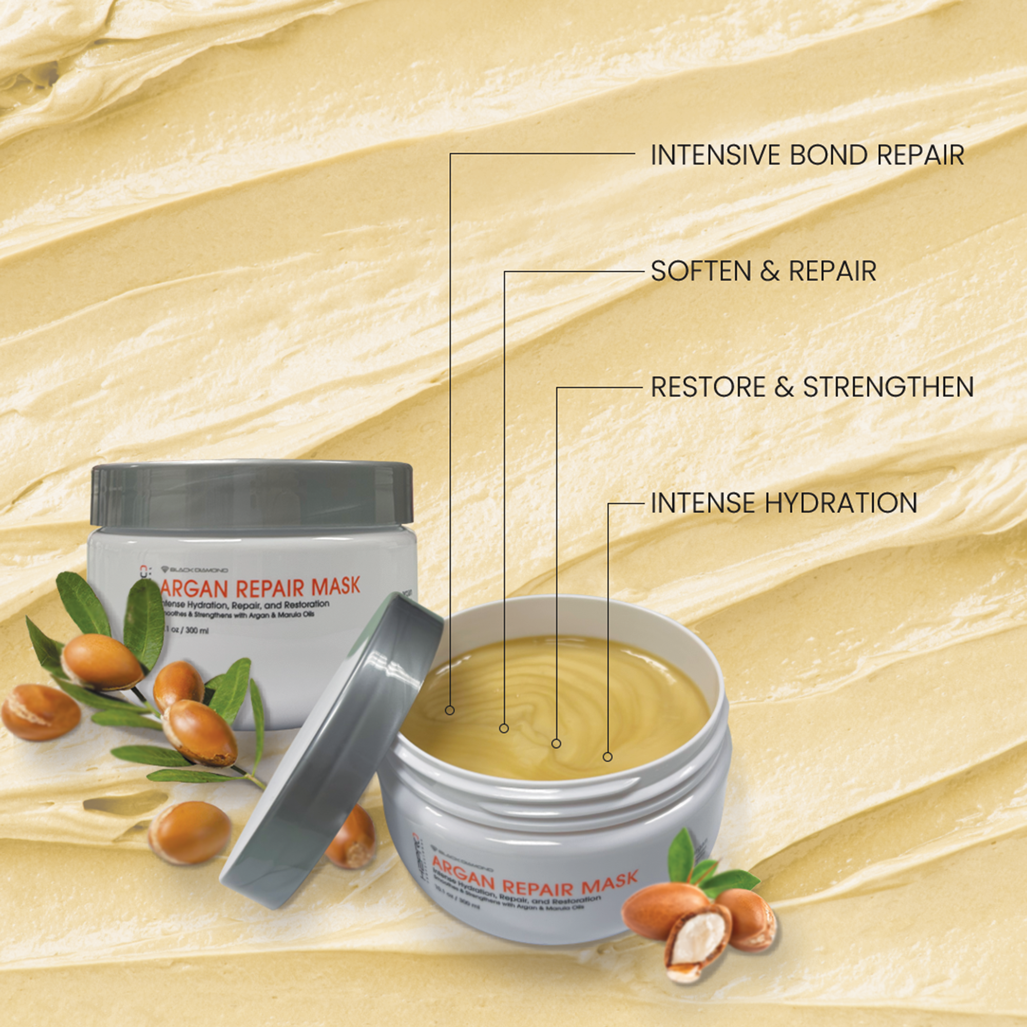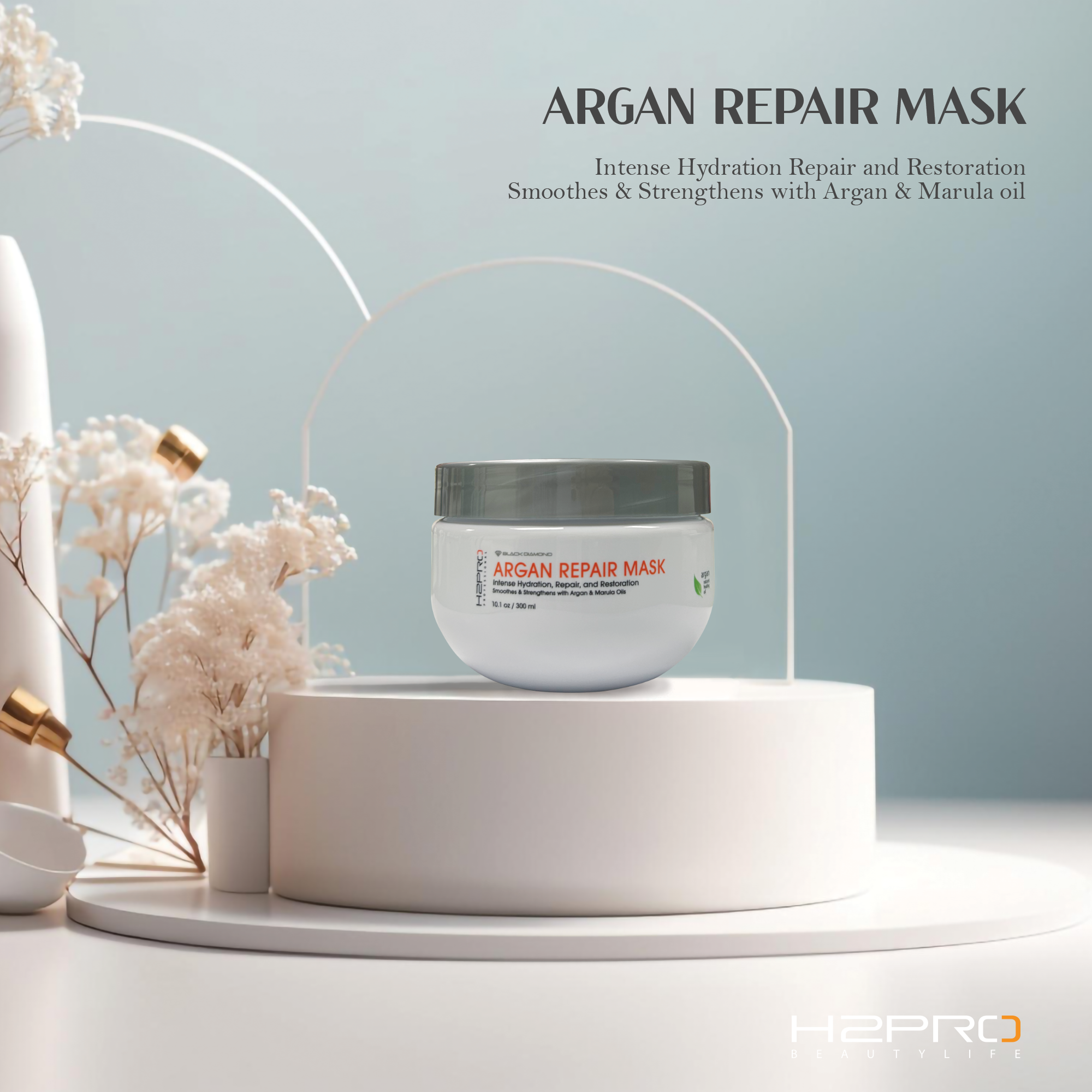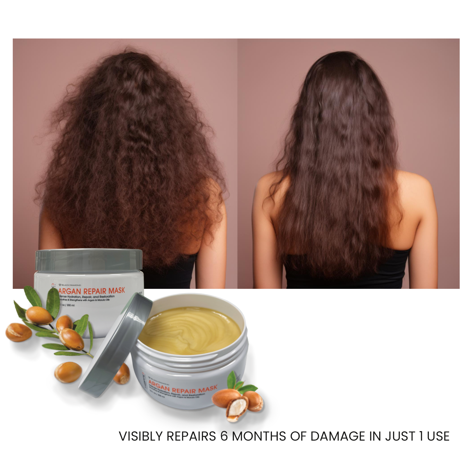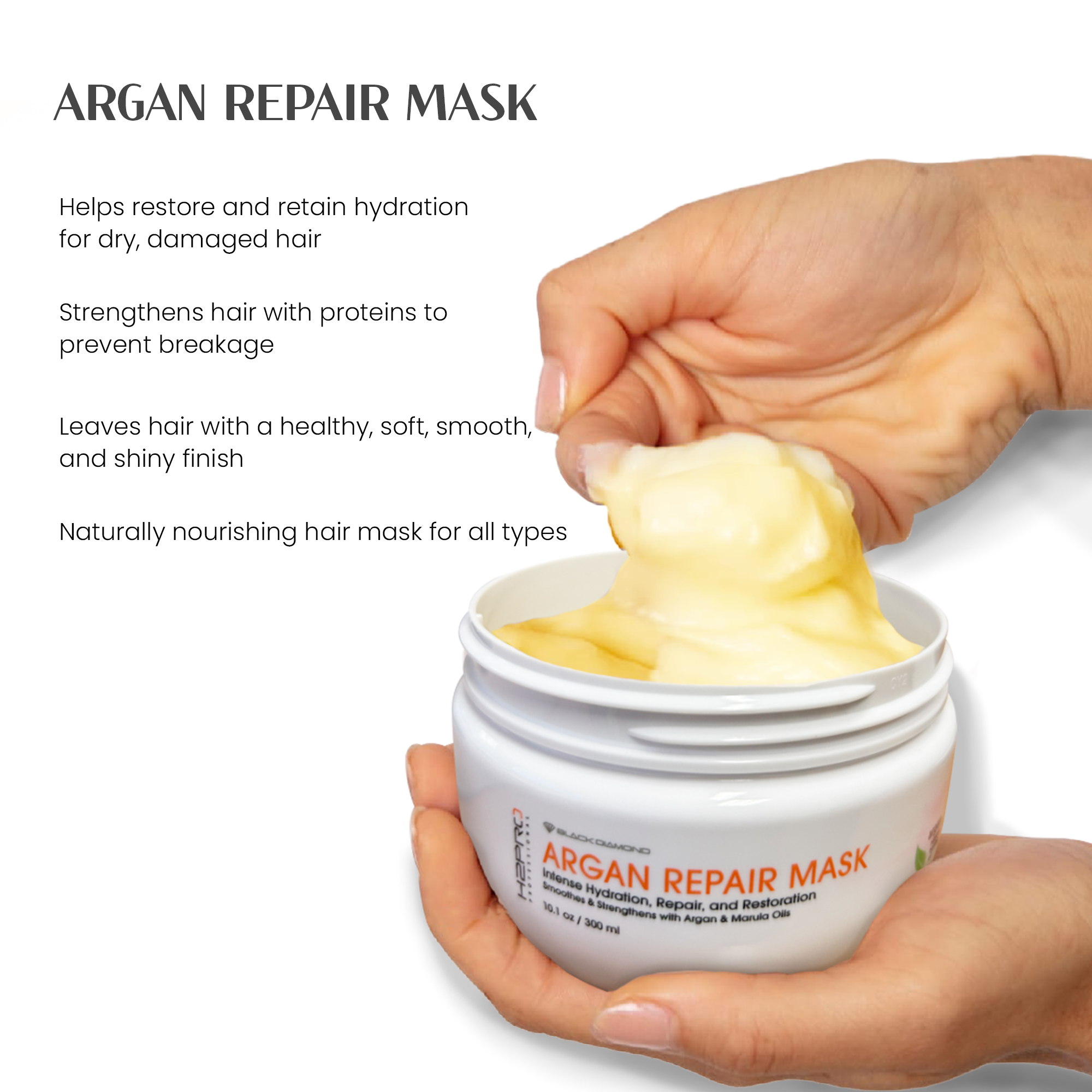 The H2PRO BLACK DIAMOND ARGAN REPAIR MASK offers a powerful yet gentle solution for all hair types, including color-treated or chemically processed hair. Free of parabens, sulfates, phthalates, and paraffin, this mask is designed to: