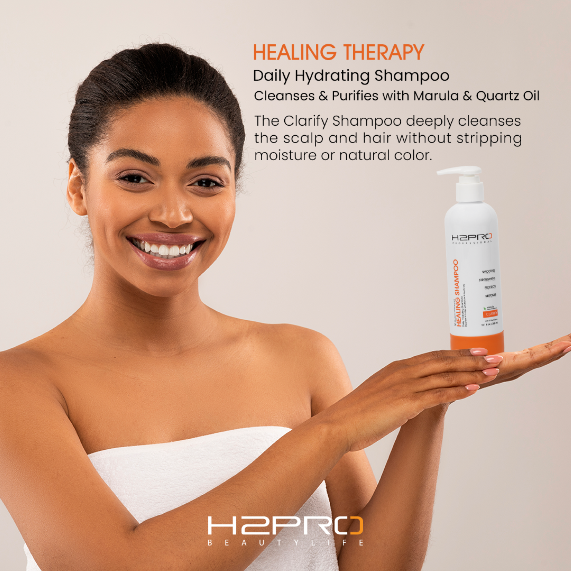 The H2PRO BLACK DIAMOND CLARIFYING SHAMPOO deeply cleanses the scalp and hair without stripping moisture or natural color.